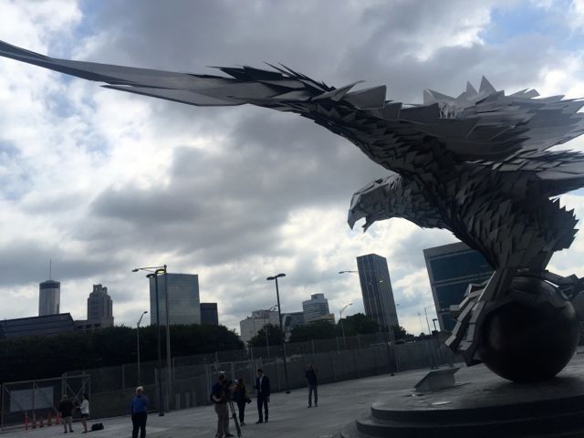 The big metal falcon in front of the stadium looks out over downtown Atlanta